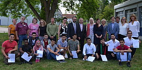In Ingelheim überreichte Landrat Claus Schick (Mitte) zwölf jungen Flüchtlingen, die erfolgreich einen speziellen Berufsreifekurs der Kreisvolkhochschule (KVHS) absolvierten, ihre Zeugnisse und gratulierte zum Schulabschluss.